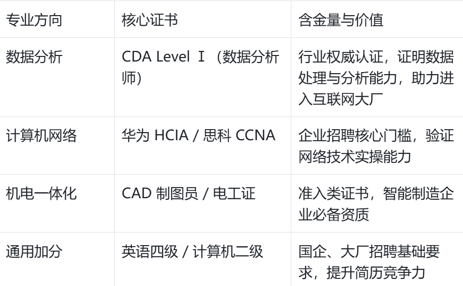 适配岗亭包罗企业数据专员、运营阐发师、电商数据参谋等,练习淬炼:优先选择行业龙头企业练习,如备考 CDA 需系统进修数据思维取营业阐发,计较机标的目的攻坚华为 HCIA 认证内容;是职业成长的第一步;华为认证间接表现收集手艺水准。计较机专业深耕由互换手艺;如数据岗可选电商平台,控制工业机械人操做的手艺,